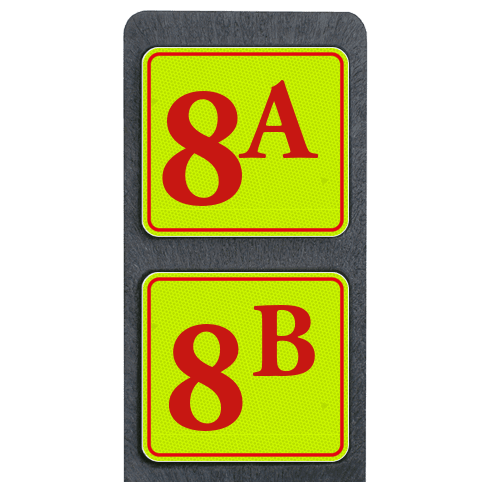 Huisnummerpaal met twee bordjes rood/geel fluorescerend - klassiek lettertype