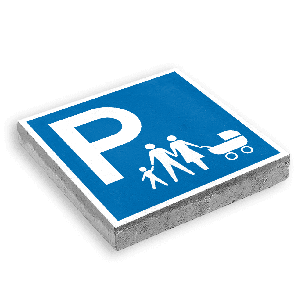 Betonnen stoeptegel bedrukt met het herkenbare parkeren voor gezinnen symbool. Parkeertegels zijn een goede herkenbare aanvulling op verkeers- of parkeerborden.